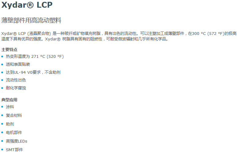 C、LCP的耐氣候性、耐輻射性良好,具有優異的阻燃性,能熄滅火焰而不再繼續進行燃燒。其燃燒等級達到UL94V-0級水平。