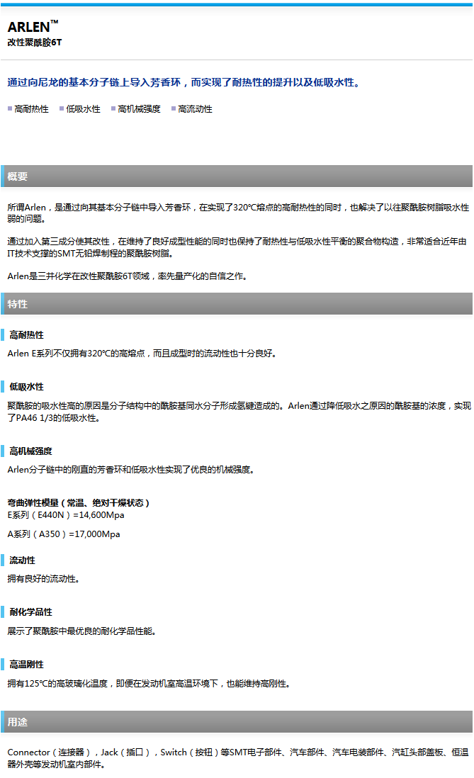 日本三井ARLEN耐熱性尼龍PA6T工程塑料