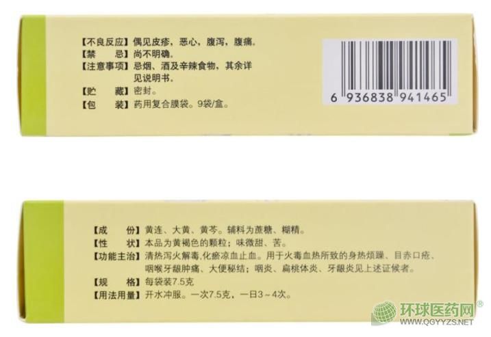 【成份】黃連、大黃、黃芩。輔料為蔗糖、糊精。
