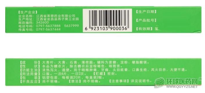 【成份】大青葉、大黃、石膏、薄荷腦。輔料為蔗糖、淀粉、硬脂酸鎂。