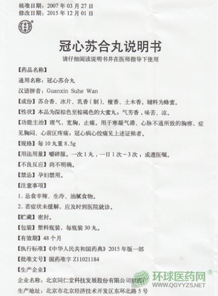 北京同仁堂冠心蘇合丸說明書圖片版