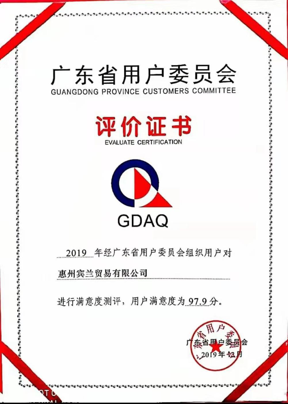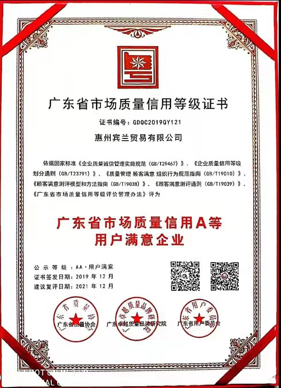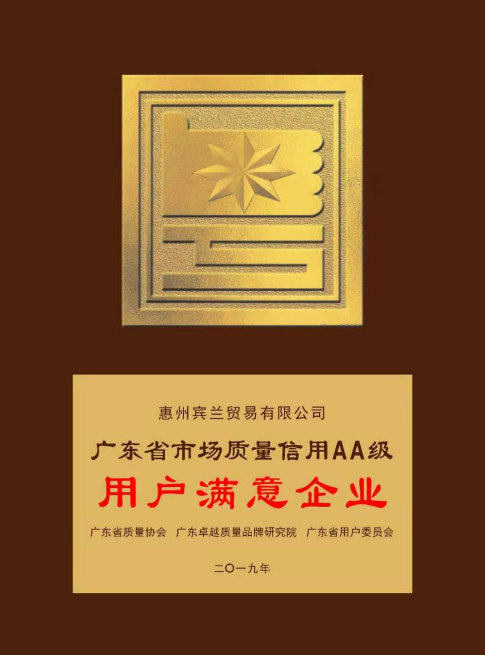 惠州賓蘭貿易有限公司榜上有名,被評為廣東省市場質量信用A等用戶滿意企業。