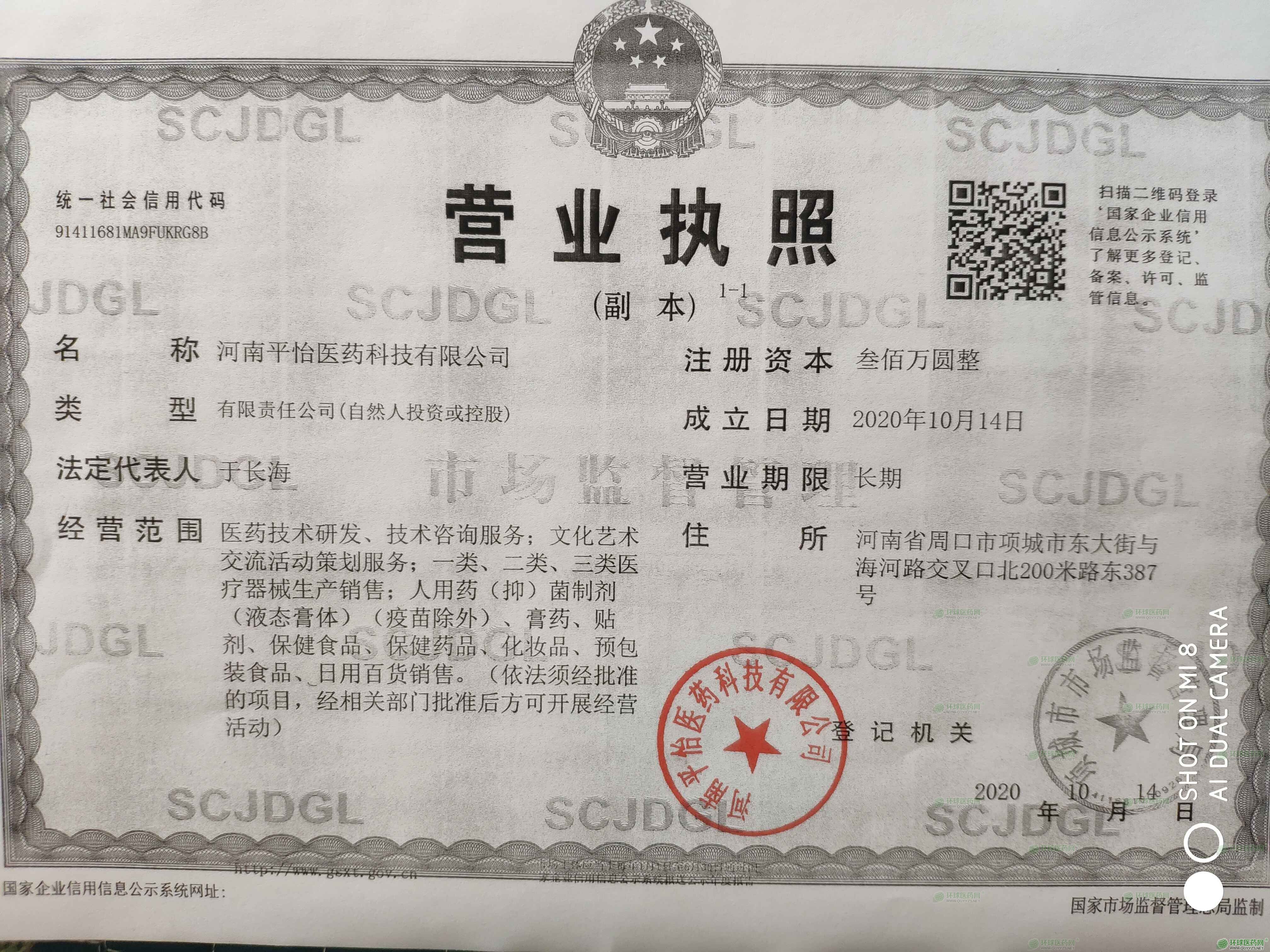 河南平怡醫(yī)藥科技有限公司成立于2020年10月14日,注冊(cè)地位于河南省周口市項(xiàng)城市東大街與海河路交叉口北200米路東387號(hào),法定代表人為于長(zhǎng)海。經(jīng)營(yíng)范圍包括醫(yī)藥技術(shù)研發(fā)、技術(shù)咨詢服務(wù);文化藝術(shù)交流活動(dòng)策劃服務(wù);一類(lèi)、二類(lèi)、三類(lèi)醫(yī)療器械生產(chǎn)銷(xiāo)售;人用藥(抑)菌制劑(液態(tài)膏體)(疫苗除外)、膏藥、貼劑、保健食品、保健藥品、化妝品、預(yù)包裝食品、日用百貨銷(xiāo)售。