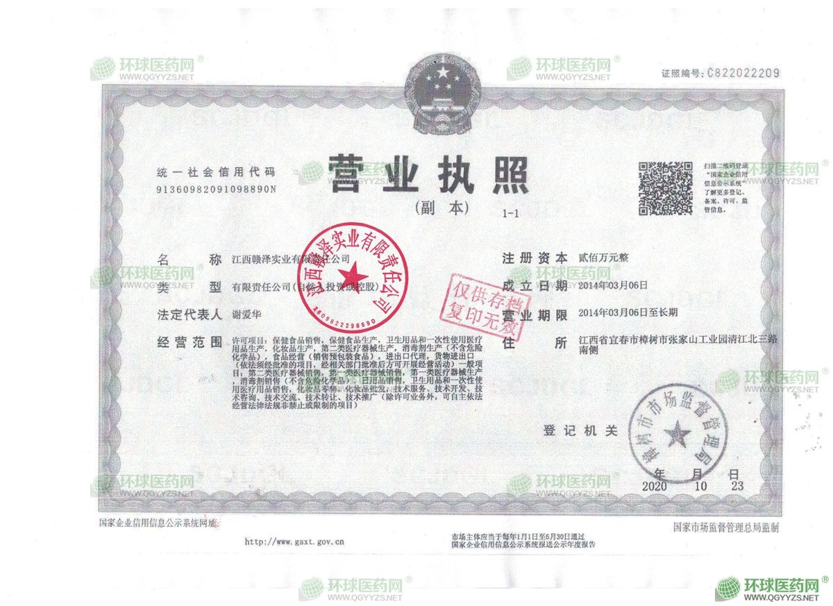 江西贛澤實業有限責任公司成立于2014年03月06日,注冊地位于江西省宜春市樟樹市張家山工業園清江北三路南側,法定代表人為謝愛華。經營范圍包括許可項目:保健食品銷售,保健食品生產,衛生用品和一次性使用醫療用品生產,化妝品生產,第二類醫療器械生產,消毒劑生產(不含危險化學品),食品經營(銷售預包裝食品),進出口代理,貨物進出口(依法須經批準的項目,經相關部門批準后方可開展經營活動)一般項目:第二類醫療器械銷售,**類醫療器械銷售,**類醫療器械生產,消毒劑銷售(不含危險化學品),日用品銷售,衛生用品和一次性使用醫療用品銷售,化妝品零售,化妝品批發,技術服務、技術開發、技術咨詢、技術交流、技術轉讓、技術推廣(除許可業務外,可自主依法經營法律法規非禁止或限制的項目。
