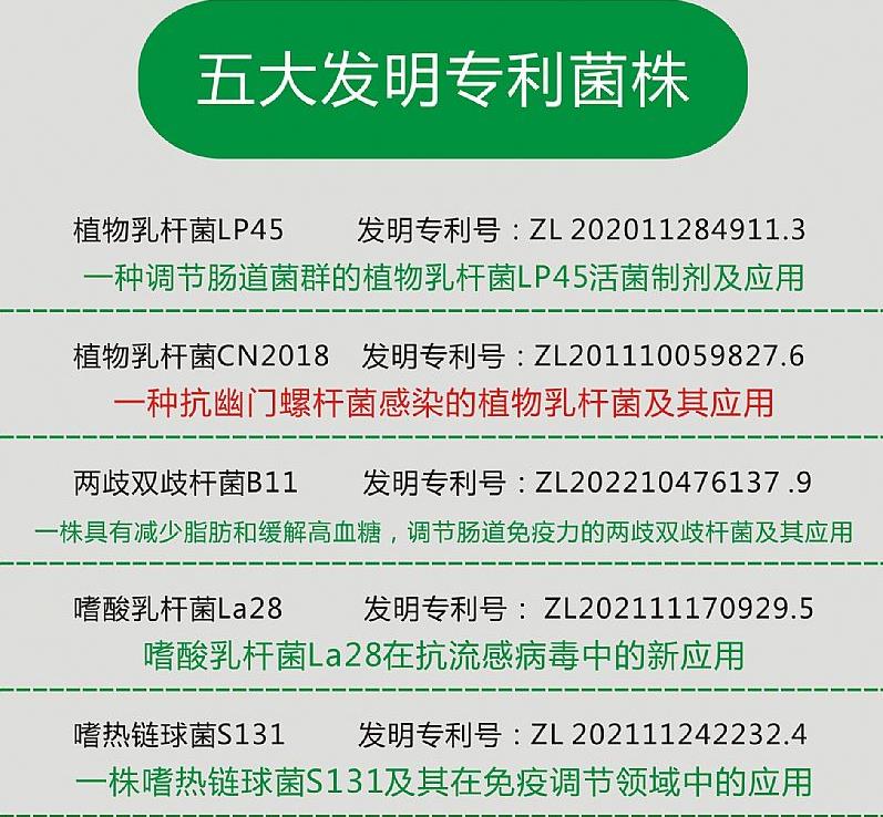 ②專利菌種,添加五大發明專利菌株,尤其是可抗幽門螺旋桿菌專利菌株。專利號:Zl 201110059827.6,一種抗幽門螺桿菌感染的植物乳桿菌及其應用。
