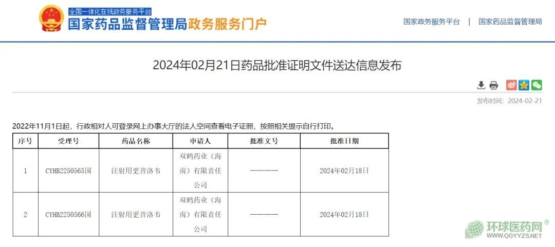 - 2024年2月21日,國家藥監(jiān)局官網(wǎng)發(fā)布最新藥品批準(zhǔn)證明文件。本次僅雙鶴藥業(yè)的注射用更昔洛韋藥品補(bǔ)充申請(qǐng)獲批,通過一致性評(píng)價(jià)。 注
