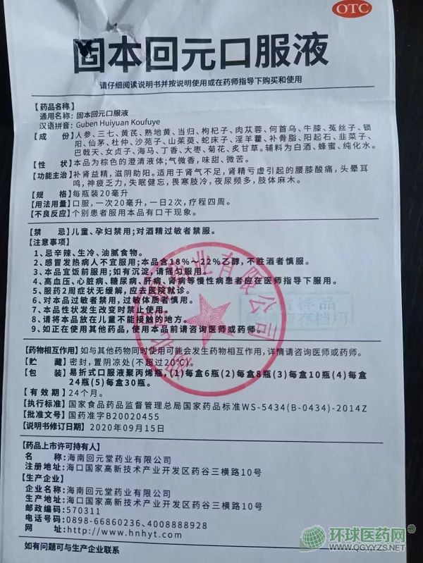 通用名稱:固本回元口服液