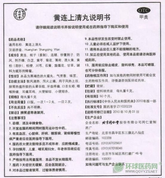 - 本頁面信息僅供參考,請以產(chǎn)品實際附帶說明書為準(zhǔn)。 同仁堂黃連上清丸 說明書文字版 【藥品名稱】 通用名稱:黃連上清丸 商品