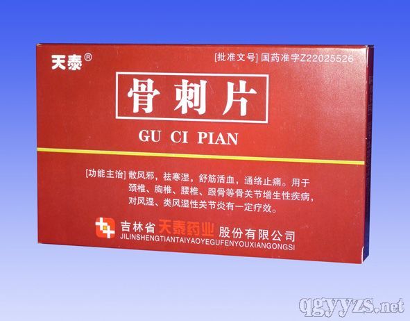骨刺片,中成藥名。由昆布、骨碎補、黨參、桂枝、威靈仙、牡蠣(煅)、杜仲葉、雞血藤、附片、制川烏、制草烏、延胡索(制)、白芍、三七、馬錢子粉組成。具有散風邪,祛寒濕,舒筋活血,通絡止痛的功效。用于頸椎、胸椎、腰椎、跟骨等骨關節增生性疾病,對風濕、類風濕性關節炎有一定療效。