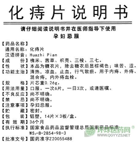 化痔片,中成藥名。由槐米、茜草、枳殼、三棱、三七組成。具有清熱,涼血,止血,行氣散瘀的功效。用于內痔、外痔、混合痔,內外痔血栓。