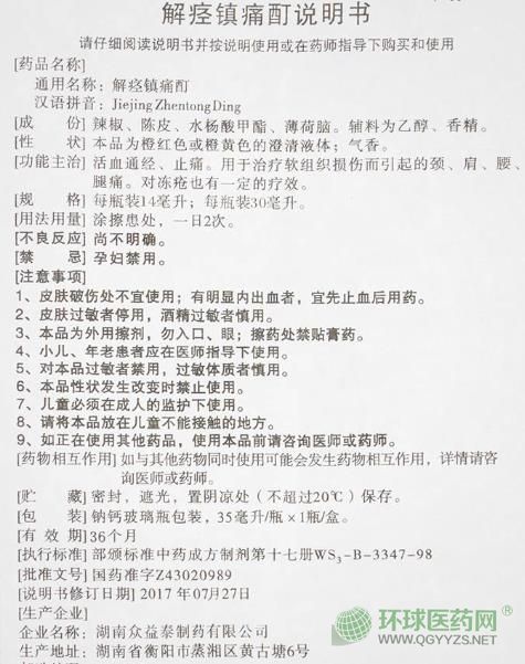 解痙鎮痛酊 ,中成藥名。由辣椒浸出液、陳皮浸出液、水楊酸甲酯、薄荷腦組成。具有活血通經、止痛功效。用于治療軟組織損傷而引起的頸、肩、腰、腿痛。對凍瘡也有一定療效。