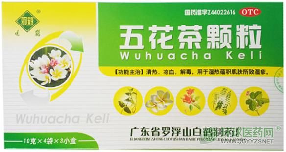 五花茶顆粒,中成藥名。由金銀花、雞蛋花、木棉花、槐花、葛花、甘草組成。具有清熱,涼血,解毒的功效。用于濕熱蘊積肌膚所致濕疹。