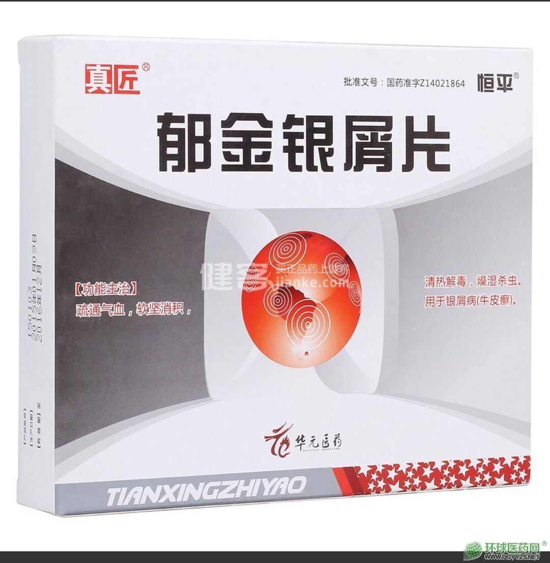郁金銀屑片,中成藥名。由秦艽、當歸、石菖蒲、黃柏、香附(酒制)、郁金(醋制)、莪術(醋制)、雄黃、馬錢子粉、皂角刺、桃仁、紅花、乳香(醋制)、硇砂、玄明粉、大黃、土鱉蟲、青黛、木鱉子組成。具有疏通氣血,軟堅消積,清熱解毒,燥濕殺蟲的功效。用于銀屑病(牛皮癬)。