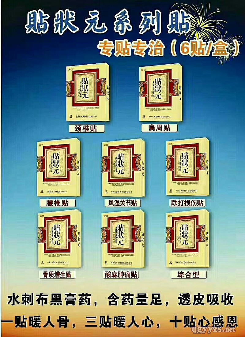 | 產(chǎn)品賣點(diǎn) | 貼狀元的賣點(diǎn): 包裝用的是350克寧波白卡,盒子尺寸190*140*20,包裝大氣上檔次 一盒是2袋,一袋3貼,價(jià)格低,效果好,性價(jià)比高 一類械備字,多種渠道可以銷售,針對12種消費(fèi)人群,適用范圍廣泛,利于銷售 走貨快,新批號,有效期兩年,更好銷售 |