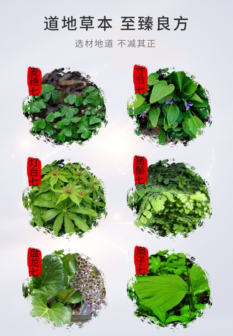 | 主要成分 | 麥穗七、寸節(jié)七、燈臺七、豬鬃七、羊膻七、盤龍七、扇子七、醋酸氯已定 |