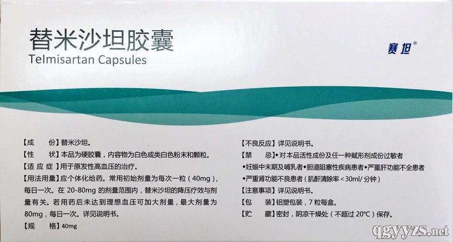 成人應(yīng)個(gè)體化給藥。常用初始劑量為每次一粒(40mg),每日一次。在20~80mg的劑量范圍內(nèi),替米沙坦的降壓療效與劑量有關(guān)。若用藥后未達(dá)到理想血壓可加大劑量,*大劑量為80mg,每日一次。本品可與噻嗪類利尿藥合用,此類利尿藥與本品有協(xié)同降壓作用。因替米沙坦在療程開(kāi)始后四至八周才能發(fā)揮*大作用,因此若欲加大藥物劑量時(shí),應(yīng)對(duì)此予以考慮。 |