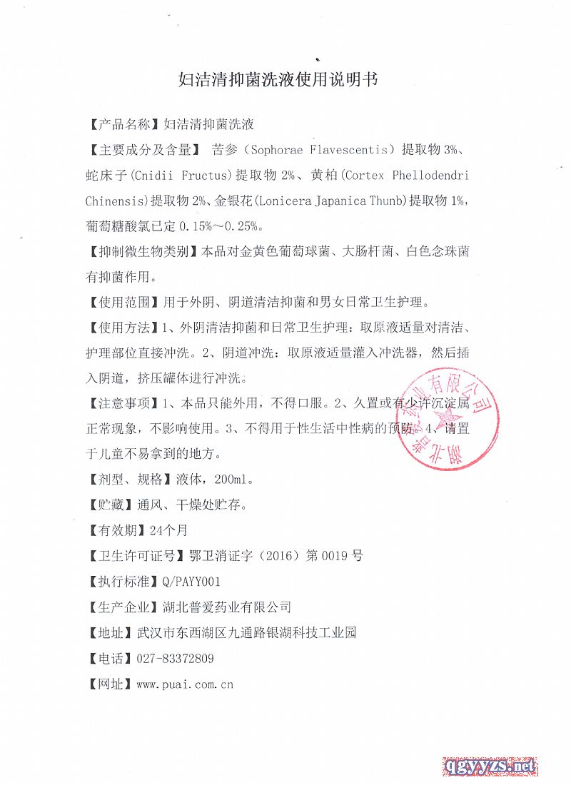 | 主要成分 | 以葡萄糖酸氯已定、純化水及苦參、蛇床子、黃柏、金銀花等植物提取液制備的婦潔清抑菌洗液 |