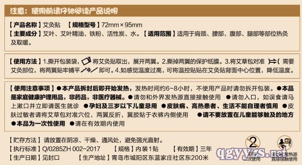 | 補(bǔ)充說(shuō)明 | 1、本產(chǎn)品是家庭健康護(hù)理產(chǎn)品,非藥品,非醫(yī)療器械; 2、孕婦忌用,三歲以下兒童建議隔物灸 3、皮膚病、高熱患者、生活不能治理者慎用。 4、本品為一次性使用 |