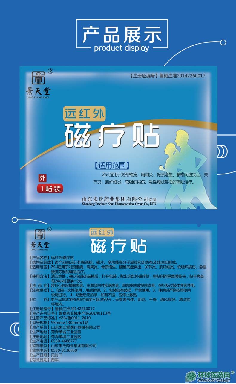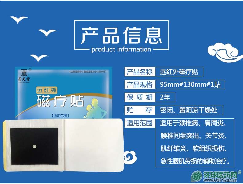 | 使用方法 | 清潔患處,確認包裝無破損后,打開包裝,取出遠紅外磁療貼,將貼劑的隔離膜撕去,貼于患處,每24小時更換一次。 |