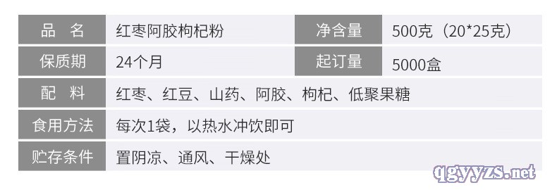 | 補充說明 | 配料:紅棗、紅豆、山藥、阿膠、枸杞、低聚果糖 凈含量:500克(20*25克) 貯存條件:置陰涼、通風、干燥處 食用方法:每次1袋,以熱水沖飲即可。 保質期:24個月 |