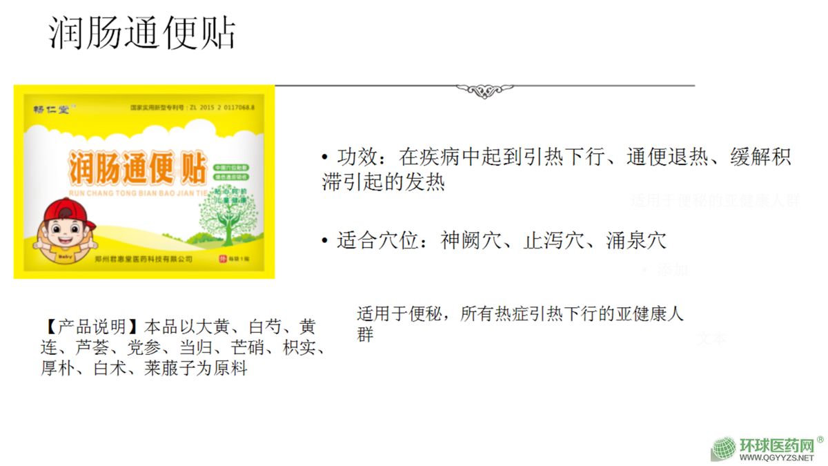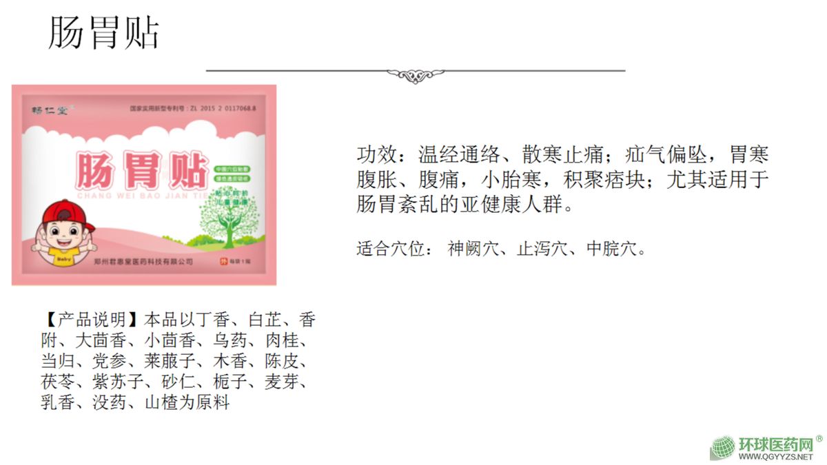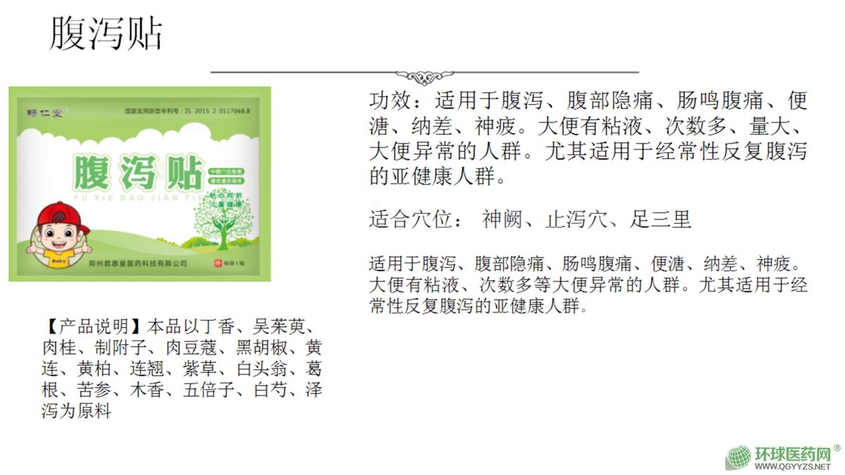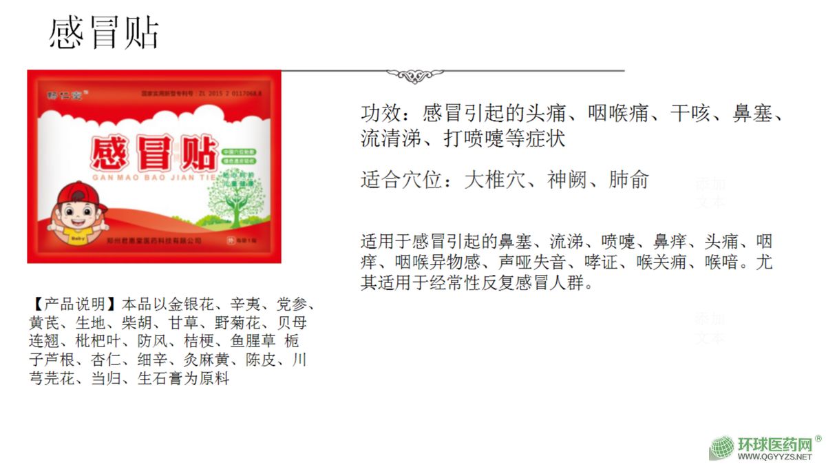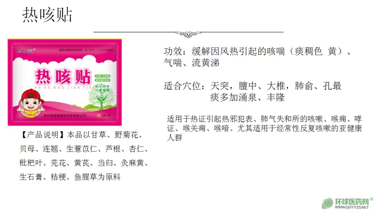 | 產品用途 | 主要開發生產兒童的現代醫療外貼劑,其主打兒童系列外貼,為純中藥制劑,主要殺滅、抑制細菌、病毒、支原體,治療兒童的咳嗽、發燒、腹瀉、厭食等病癥 |