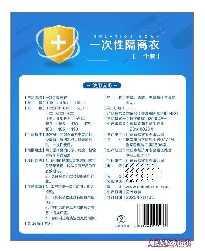 | 產(chǎn)品用途 | 通常采用非織造布為主要原料,經(jīng)裁剪、縫紉制成。非無菌提供,一次性使用。用于醫(yī)療機(jī)構(gòu)門診、病房、檢驗(yàn)室等作普通隔離。 |