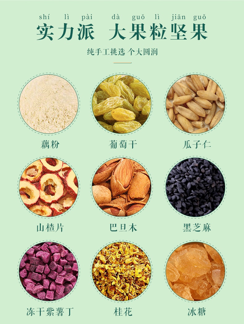 | 主要成分 | 藕粉、葡萄干、瓜子仁、山楂片、巴旦木、黑芝麻、凍干紫薯丁、桂花、冰糖 |