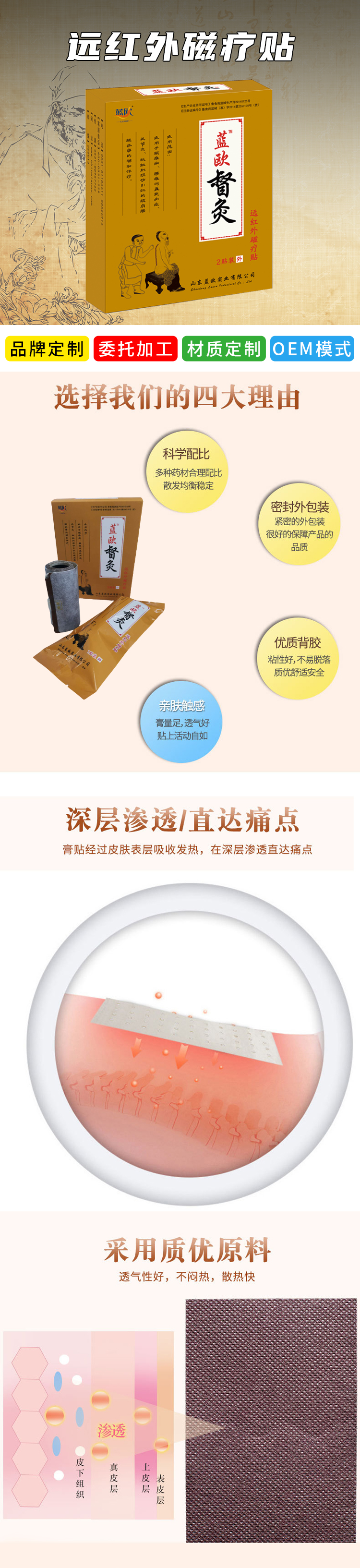 | 補(bǔ)充說(shuō)明 | 產(chǎn)品采用進(jìn)口醫(yī)用水刺無(wú)紡布,舒適度高,透氣性強(qiáng),粘性好,不拔汗毛,先發(fā)涼后發(fā)熱,能夠讓肌膚更加適應(yīng),不過(guò)敏,更能夠*大成度上舒張毛孔,達(dá)到直達(dá)病灶,透皮吸收的*佳療效,尺寸大,可根據(jù)不同部位進(jìn)行裁剪,不浪費(fèi),可直接用于背部脊椎貼敷,采用醫(yī)用進(jìn)口壓敏膠,可適應(yīng)不同皮膚體質(zhì),本產(chǎn)品配方延續(xù)古老配方科學(xué)改進(jìn),能夠發(fā)揮出*大的藥效,樣式古樸美觀,陳列大方,銷售量大,綜合治療,藥效集中,患者認(rèn)可度、復(fù)購(gòu)率較高,是屬于市場(chǎng)良性循環(huán)的中高端產(chǎn)品,**空間高 |