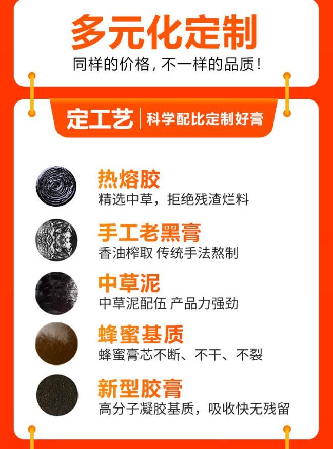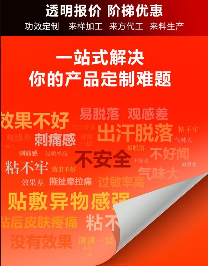 | 補充說明 | 注意事項:1市場大:膏藥的空白市場很大, 消費群體廣大。每個人都可能用到膏藥,并且有嚴格的區域保護。 2經營活:可以自己在電商、微信上賣,可以做直播、短視頻,也可以和各大醫院、藥店、美容店合作。 3品種多:膏藥有:骨科、兒科、婦科、癥狀類等;瘖y品有面膜、精華液、水乳霜、彩妝、套盒、洗沐護等。 4操作易:專業的客服團隊每月定期回訪,根據不同市場提供指導、培訓、廣告、促銷活動支持! 6產品好:20年膏藥生產經驗,膏藥效果經得住考驗,終端客戶好評如潮! 7賺錢快:好產品并且手續正規貨源跟得上,廠家直銷,消費人群廣 貯藏:干燥陰涼 禁忌:無 保質期:兩年 備注:1、優質服務:專業OEM服務團隊一對一服務,從設計到出貨全程專人跟進。 2、出貨迅速:包裝定稿,專業生產團隊可在10—15天內交付發貨。 3、質量**:從生產至出廠五道質檢嚴格把關,全自動四邊封口機器密封性更好,產品更美觀 4、權威認證:國家FDA認證的一類醫療器械文號,藥監局可查,十萬級凈化標準生產車間,品質有**。 5、經驗豐富:20年生產加工經驗,已為上百個品牌提供服務,產品已出口多個國家和地區。 6、產量充足:現代化生產車間、進口全自動生產線,日產量100萬片。 7、品類齊全:300多款成熟配方(妝字號、械字號、消字號)免費打樣 |
