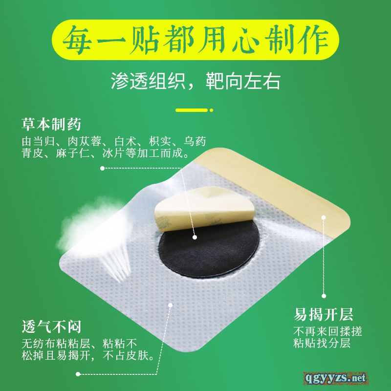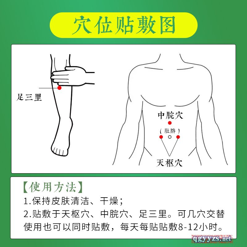 | 使用方法 | 【使用方法】 1.保持皮膚清潔、干燥; 2.貼敷于天樞穴、中院穴、足三里。可幾穴交替使用也可以同時(shí)貼敷,每天每貼貼敷8-12小時(shí)。 |