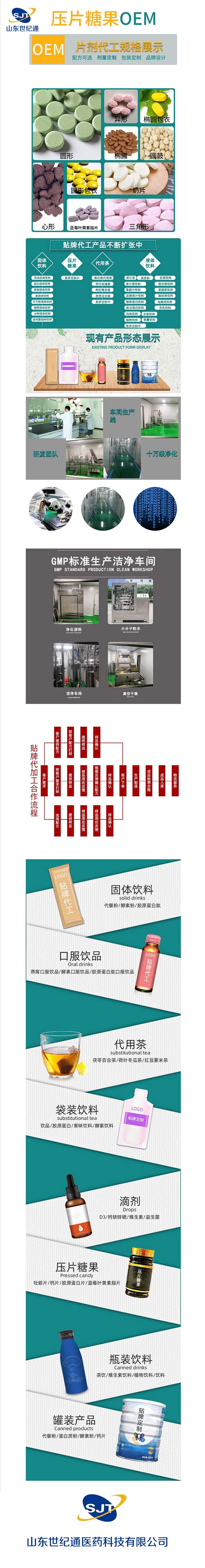 | 補充說明 | 山東世紀通醫藥科技專注功能性健康食品委托生產代加工十六年,具有豐富的行業資源和生產經驗。委托生產范圍:食品類包括:固體飲料、壓片糖果、代用茶、含茶制品、茶葉分裝等。保健食品類包括:壓片糖果、固體飲料、風味飲品等。更多產品及配方研發,歡迎來電咨詢洽談,歡迎來廠參觀!山東世紀通全體人員以滿腔的熱情支持客戶的成功,期待和您合作共贏! |