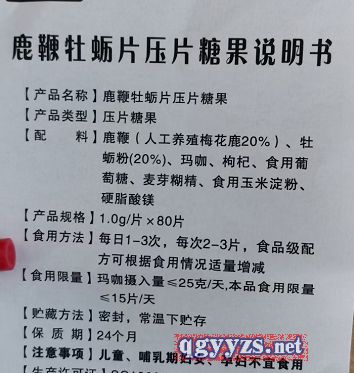 | 主要成分 | 產(chǎn)品名稱:鹿鞭牡蠣片 產(chǎn)品類型:壓片糖果 配料:鹿鞭(人工養(yǎng)殖梅花鹿20%),牡蠣粉20%,瑪咖,枸杞,食用葡萄糖,麥芽糊精、食用玉米淀粉、硬脂酸鎂。 產(chǎn)品規(guī)格:1g*80片/盒/ |