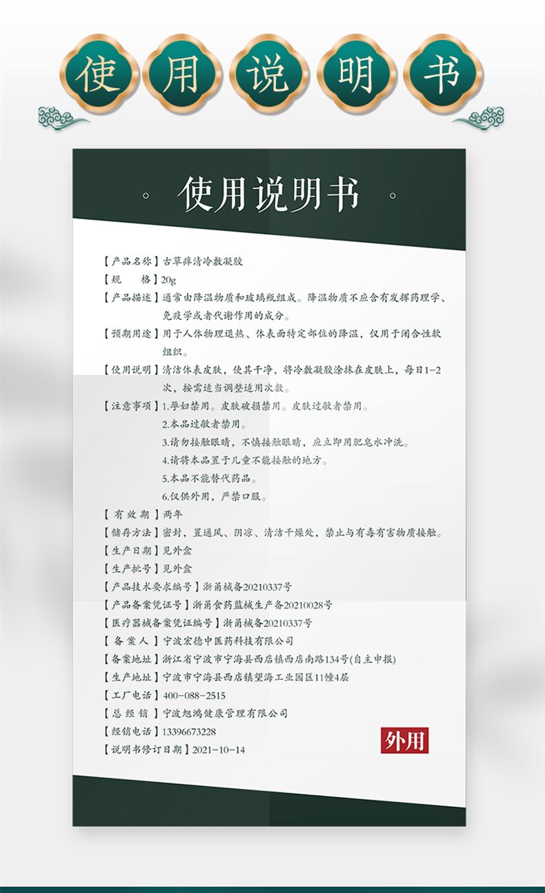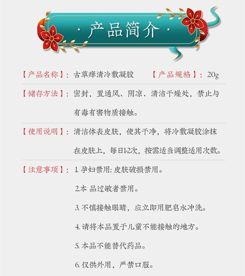 | 產(chǎn)品用途 | 古草癢清,中藥提取物,冷敷凝膠,適用于皮膚瘙癢、濕疹、皮炎、蚊蟲叮咬等! |