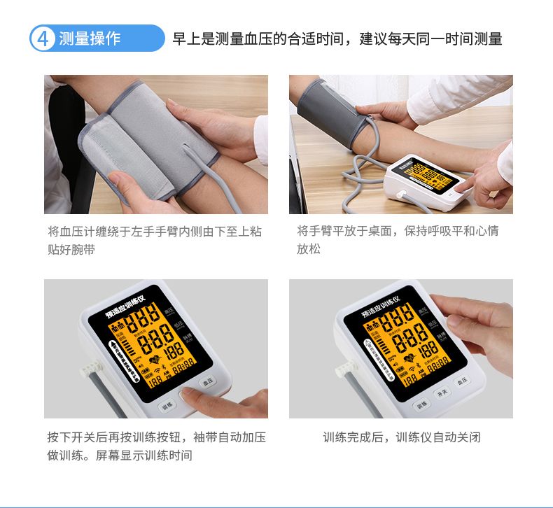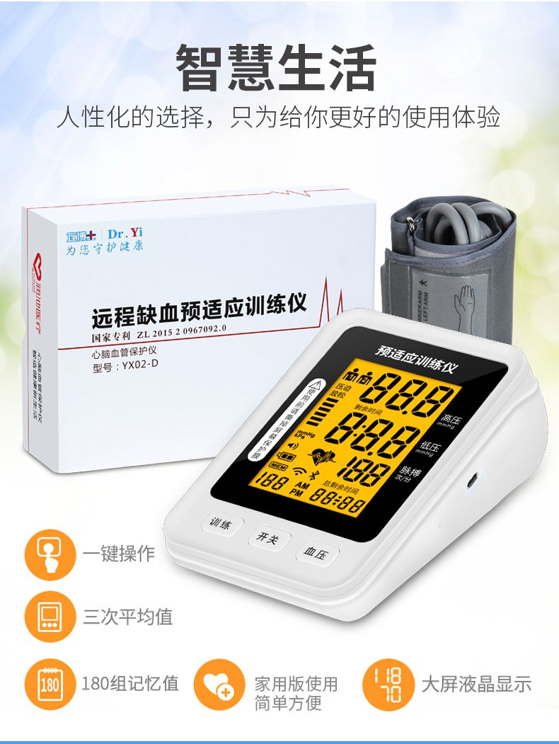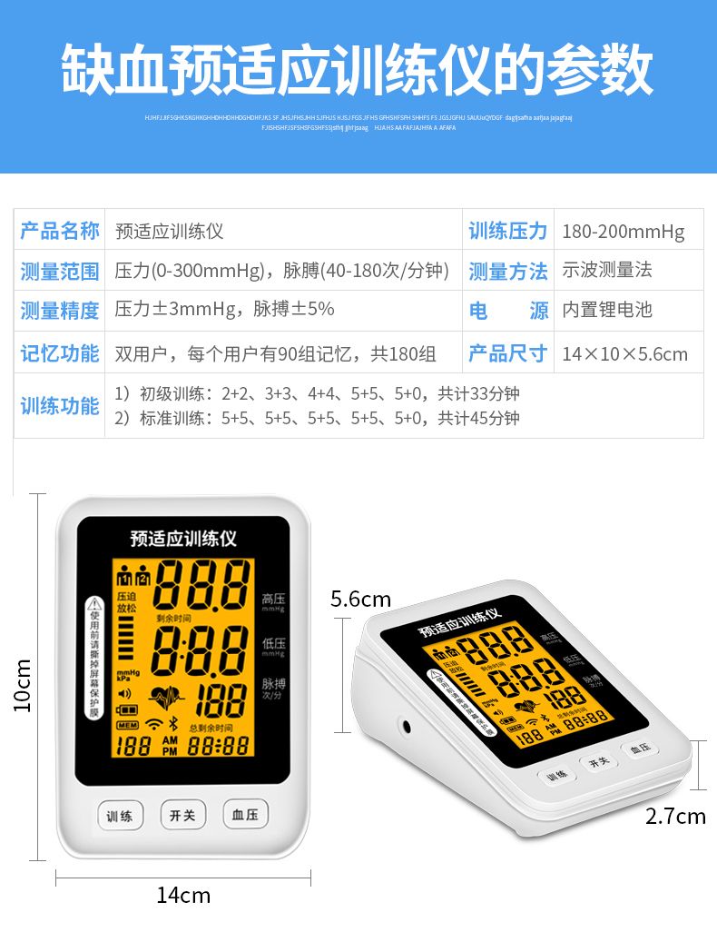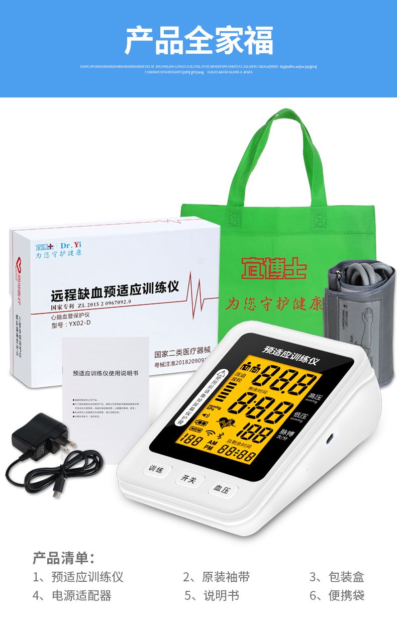 | 產(chǎn)品賣(mài)點(diǎn) | 預(yù)適應(yīng)訓(xùn)練儀好處:一次預(yù)適應(yīng)訓(xùn)練相當(dāng)于跑5000米血液循環(huán)運(yùn)動(dòng)量; ①改善睡眠;②預(yù)防心梗腦梗;③增加血管彈性;④使血管壁光滑;⑤促進(jìn)血液循環(huán);⑥調(diào)整血壓 產(chǎn)品優(yōu)勢(shì):①一鍵操作智能測(cè)壓;②醫(yī)用標(biāo)準(zhǔn)語(yǔ)音播報(bào);③超薄設(shè)計(jì)專利產(chǎn)品;④內(nèi)置鋰電環(huán)保節(jié)能;⑤高清屏顯;⑥兩用,可測(cè)量可訓(xùn)練保健康! |