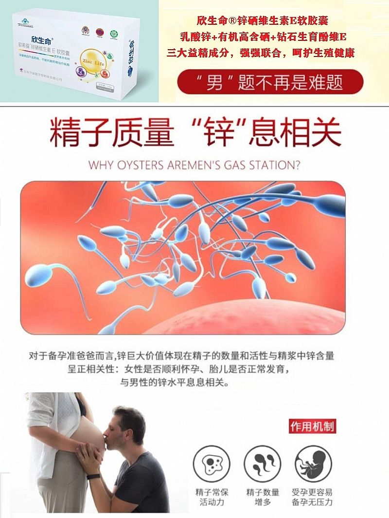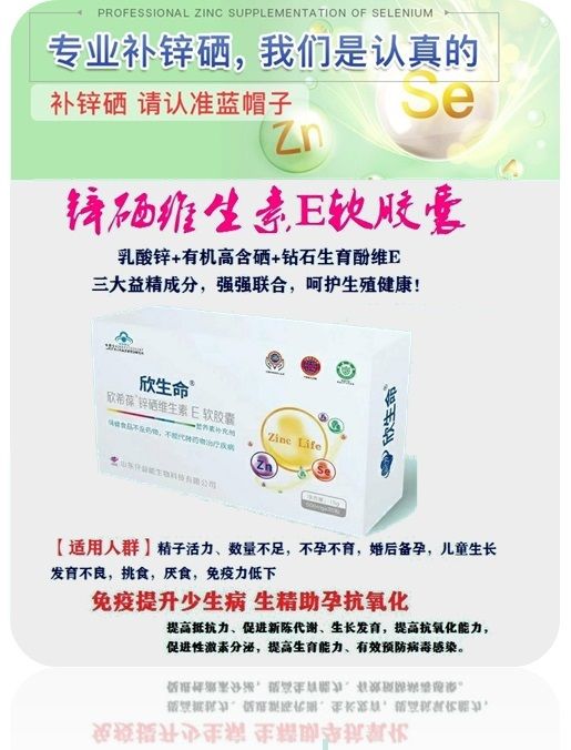 | 補(bǔ)充說明 | 本品是以乳酸鋅、富硒酵母、dl-a-醋酸生育酚為主要原料制成的保健品,經(jīng)功能試驗(yàn)證明,本品具有補(bǔ)充鋅、硒、維生素E免疫調(diào)節(jié)的保健功能。 主要原料:每粒含(鋅4.0mg、硒24ug、維生素E5.0mg、) 1、男性生殖功能低下者:少精子、弱精子、畸形精子或死精子所引起的不育者;性功能障礙如性欲減退、勃起困難、早泄等;慢性前列腺炎;性器官發(fā)育不良等。 2、女性生殖功能低下者:卵巢發(fā)育不全、排卵障礙、子宮內(nèi)膜發(fā)育遲緩或不良、胚胎著床障礙和習(xí)慣性流產(chǎn)者。 3、有高溫妊辰史者:早產(chǎn)、產(chǎn)后出血、妊高癥、胎兒宮內(nèi)發(fā)育遲緩、畸形、死胎等。 4、體質(zhì)虛弱、免疫力低下者:經(jīng)常感冒、低熱、乏力、盜汗等;外傷或手術(shù)后及腫瘤患者。 |