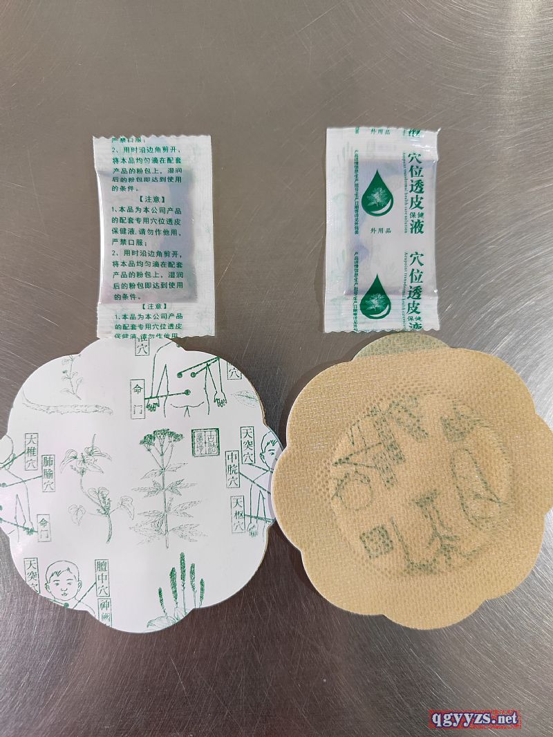 | 用法用量 | 外用,揭去防粘紙,將本品隨附的穴位透皮保健液均勻緩慢滴撒粉包上,貼于大椎穴、神闕穴、雙側(cè)涌泉穴;貼敷前用溫開水或生姜片將貼敷部位擦拭干凈,貼敷后在粉包部位輕揉按壓更佳。 |