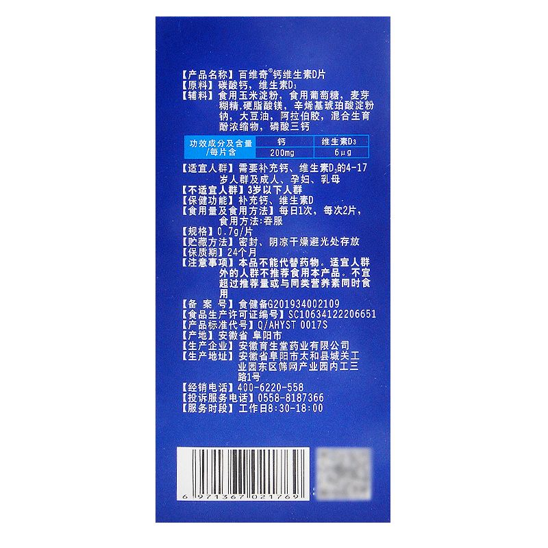 | 補充說明 | 申請人***稱:安徽育生堂藥業(yè)有限公司 功效成分/標志性 成分含量:每片含:鈣200mg 維生素D3 6μg 不適宜人群:3歲以下人群 貯藏方法:密封、陰涼干燥避光處存放 主要原料:碳酸鈣,維生素D3 批準文號:食健備G201934002109 產(chǎn)品標準號:SC10634122206651 廠名:安徽育生堂藥業(yè)有限公司 廠址:安徽省阜陽市太和縣城關工業(yè)園東區(qū)篩網(wǎng)產(chǎn)業(yè)園內(nèi) 保質(zhì)期:730天 產(chǎn)品名稱:百維奇?鈣維生素D 食用方法和食用量:每日1次,每次2片, 食用方法:吞服 注意事項:本品不能代替藥物。適宜人群外的人群不推薦食用本產(chǎn)品。不宜超過推薦量或與同類營養(yǎng)素同時食用 |