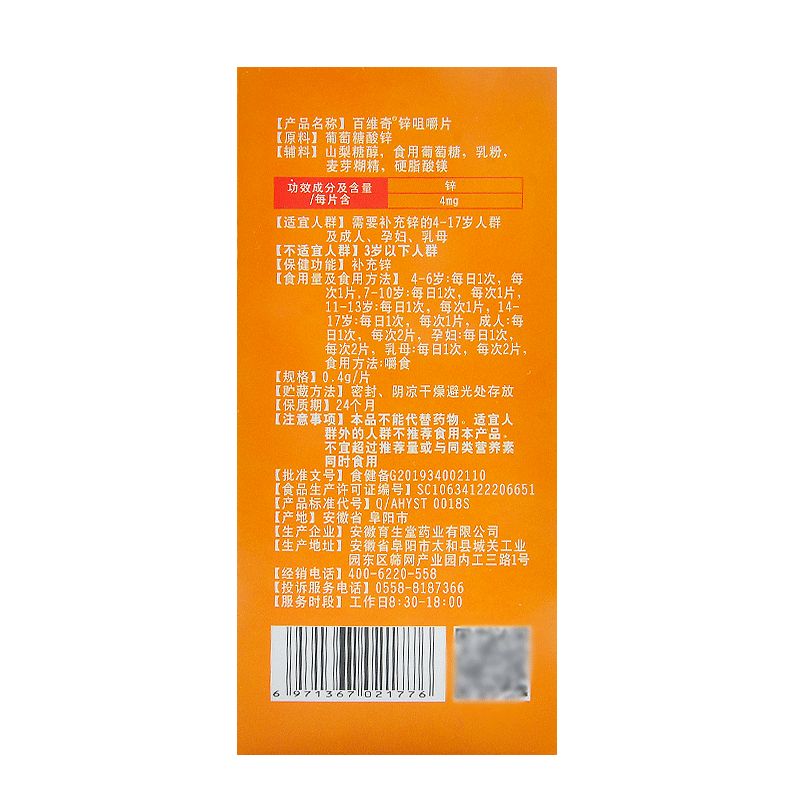 | 補充說明 | 申請人***稱:安徽育生堂藥業(yè)有限公司 功效成分/標志性成分 含量:每片含 4mg 鋅 不適宜人群:3歲以下人群 貯藏方法:密封 陰涼干燥避光處存放主要 原料:葡萄糖酸鋅 批準文號:食健備G201934002110 產(chǎn)品標準號:SC10634122206651 廠名:安徽育生堂藥業(yè)有限公司 廠址:安徽省阜陽市太和縣城關(guān)工業(yè)園東區(qū)篩網(wǎng)產(chǎn)業(yè)園內(nèi) 保質(zhì)期:730天 具體規(guī)格:0.4g/片*90片 是否進口:否 產(chǎn)品劑型:片劑保健食品 產(chǎn)品名稱:百維奇鋅咀嚼片 是否禮盒裝:否 注意事項:本品不能代替藥物。適宜人群外的人群不推薦食用本產(chǎn)品。不宜超過推薦量或與同類營養(yǎng)素同時食用。 |