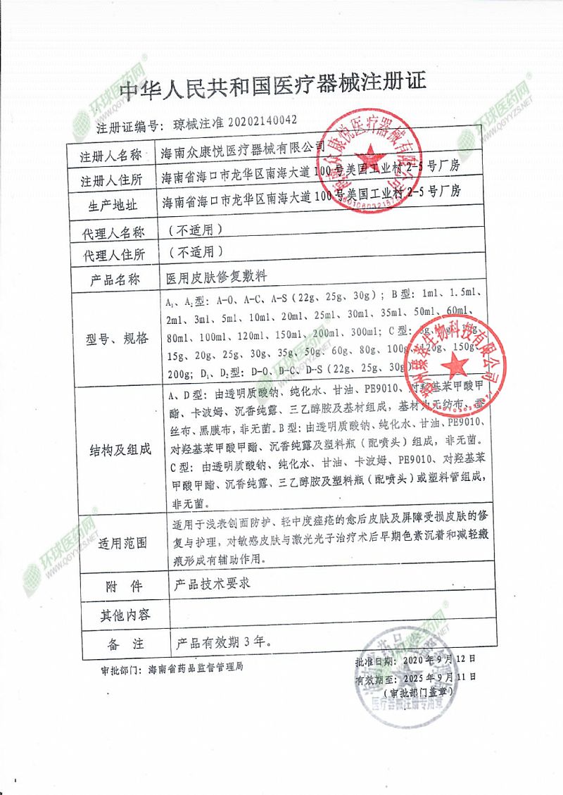 | 產品用途 | 適用于淺表創面防護、輕中度痤瘡的愈后皮膚及屏障受損皮膚的修復與護理,對敏感皮膚與激光光子治療術后早期色素沉著和減輕瘢痕形成有輔助作用。 |