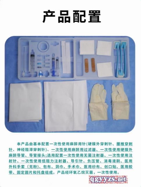 | 補(bǔ)充說明 | 本產(chǎn)品由基本配置一次性使用麻醉用針(硬膜外穿刺針、腰椎穿刺針、神經(jīng)阻滯穿刺針)、一次性使用麻醉用過濾器、一次性使用硬膜外麻醉導(dǎo)管、導(dǎo)管接頭;選用配置一次性使用無菌注射器、一次性使用注射針、一次性使用低阻力注射器、導(dǎo)引針、負(fù)壓管、消毒液刷、醫(yī)用外科手套(無粉)、包布、洞巾、手術(shù)巾、醫(yī)用紗布、創(chuàng)口貼、醫(yī)用膠帶、固定圓片和托盤組成。產(chǎn)品經(jīng)環(huán)氧乙烷滅菌,一次性使用。 |