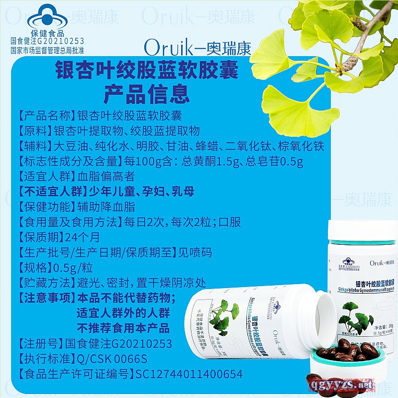 | 補(bǔ)充說(shuō)明 | 【產(chǎn)品名稱】銀杏葉絞股藍(lán)軟膠囊 【原料】銀杏葉提取物、絞股藍(lán)提取物 【輔料】大豆油、純化水、明膠、甘油、蜂蠟、二氧化鈦、棕氧化鐵 【標(biāo)志性成分及含量】每100g含:總黃酮1.5g、總皂苷0.5g 【適宜人群】血脂偏高者 【不適宜人群】少年兒童、孕婦、乳母 【保健功能】輔助降血脂 【食用量及食用方法】每日2次,每次2粒;口服 【保質(zhì)期】24個(gè)月 【生產(chǎn)批號(hào)/生產(chǎn)日期/保質(zhì)期至】見(jiàn)噴碼 【規(guī)格】0.5g/粒 【貯藏方法】避光、密封,置干燥陰涼處 【注意事項(xiàng)】本品不能代替藥物;適宜人群外的人群不推薦食用本產(chǎn)品 |