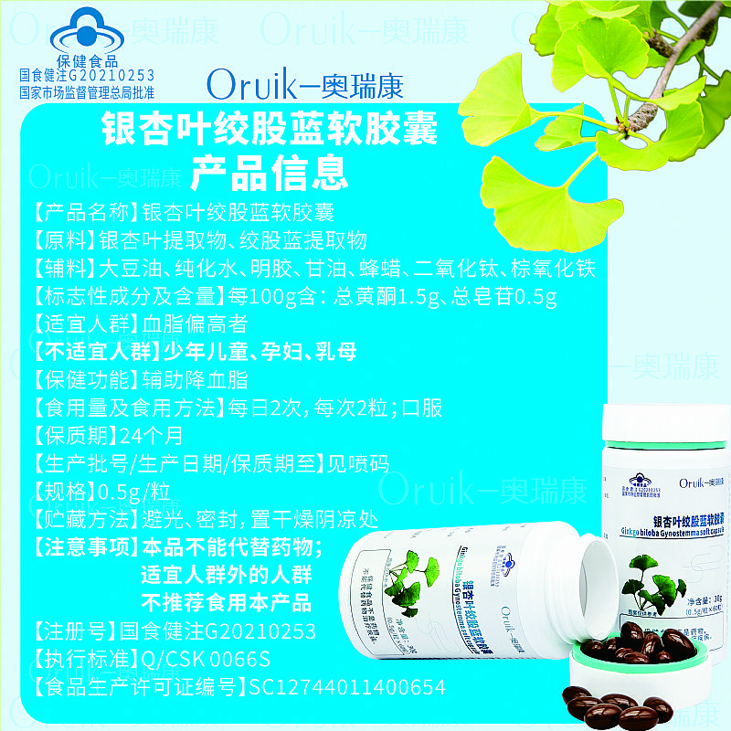 | 補充說明 | 產(chǎn)品基本信息: 【產(chǎn)品名稱】銀杏葉絞股藍軟膠囊 【原料】銀杏葉提取物、絞股藍提取物 【輔料】大豆油、純化水、明膠、甘油、蜂蠟、二氧化鈦、棕氧化鐵 【標志性成分及含量】每100g含:總黃酮1.5g、總皂苷0.5g 【適宜人群】血脂偏高者 【不適宜人群】少年兒童、孕婦、乳母 【保健功能】輔助降血脂 【食用量及食用方法】每日2次,每次2粒;口服 【保質(zhì)期】24個月 【生產(chǎn)批號/生產(chǎn)日期/保質(zhì)期至】見噴碼 【規(guī)格】0.5g/粒 【貯藏方法】避光、密封,置干燥陰涼處 【注意事項】本品不能代替藥物;適宜人群外的人群不推薦食用本產(chǎn)品 【注冊號】國食健注G20210253 【執(zhí)行標準】Q/CSK 0066S 【食品生產(chǎn)許可證編號】SC12744011400654 |