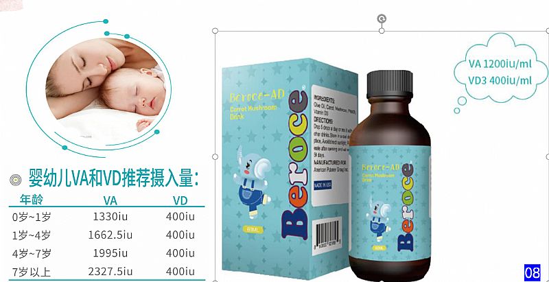 | 主要成分 | 配料:水、橄欖油、胡蘿卜、蘑菇、水蜜桃、維生素D3含量:維生素D3400IU/ml,維生素A1200IU/ml |