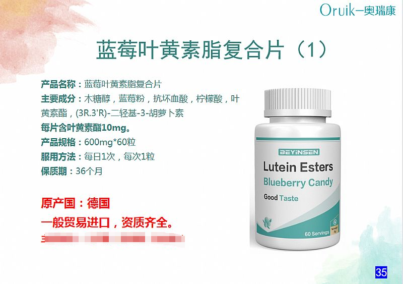 | 補(bǔ)充說(shuō)明 | 產(chǎn)品名稱(chēng):藍(lán)莓葉黃素脂復(fù)合片 主要成分:木糖醇,藍(lán)莓粉,抗壞血酸,檸檬酸,葉黃素酯,(3R.3'R)-二輕基-3-胡蘿卜素 每片含葉黃素酯10mg。 產(chǎn)品規(guī)格:600mg*60粒 服用方法:每日1次,每次1粒 保質(zhì)期:36個(gè)月 原產(chǎn)國(guó):德國(guó) 一般貿(mào)易進(jìn)口,資質(zhì)齊全。 |