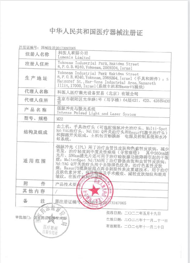 | 補(bǔ)充說(shuō)明 | M22 Universal IPL現(xiàn)在與AOPT相結(jié)合,使高級(jí)用戶能夠完全控制,從而可以輕松地為每個(gè)患者和每種情況單獨(dú)定制設(shè)置。充分利用每一次脈沖,輕松為您的患者提供一致、可靠的臨床結(jié)果! 憑借黃金線設(shè)計(jì),Lumenis自豪地向美容醫(yī)療市場(chǎng)推出一款優(yōu)質(zhì)的M22版本,提供**、安心、有效的光和激光治療。 |