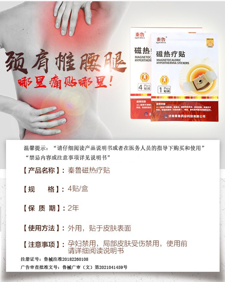 | 使用方法 | 清潔患處,確認包裝無破損后,打開包裝,取出磁熱療貼,將貼劑的隔離膜撕去,貼于患處,每24小時更換一次。 |