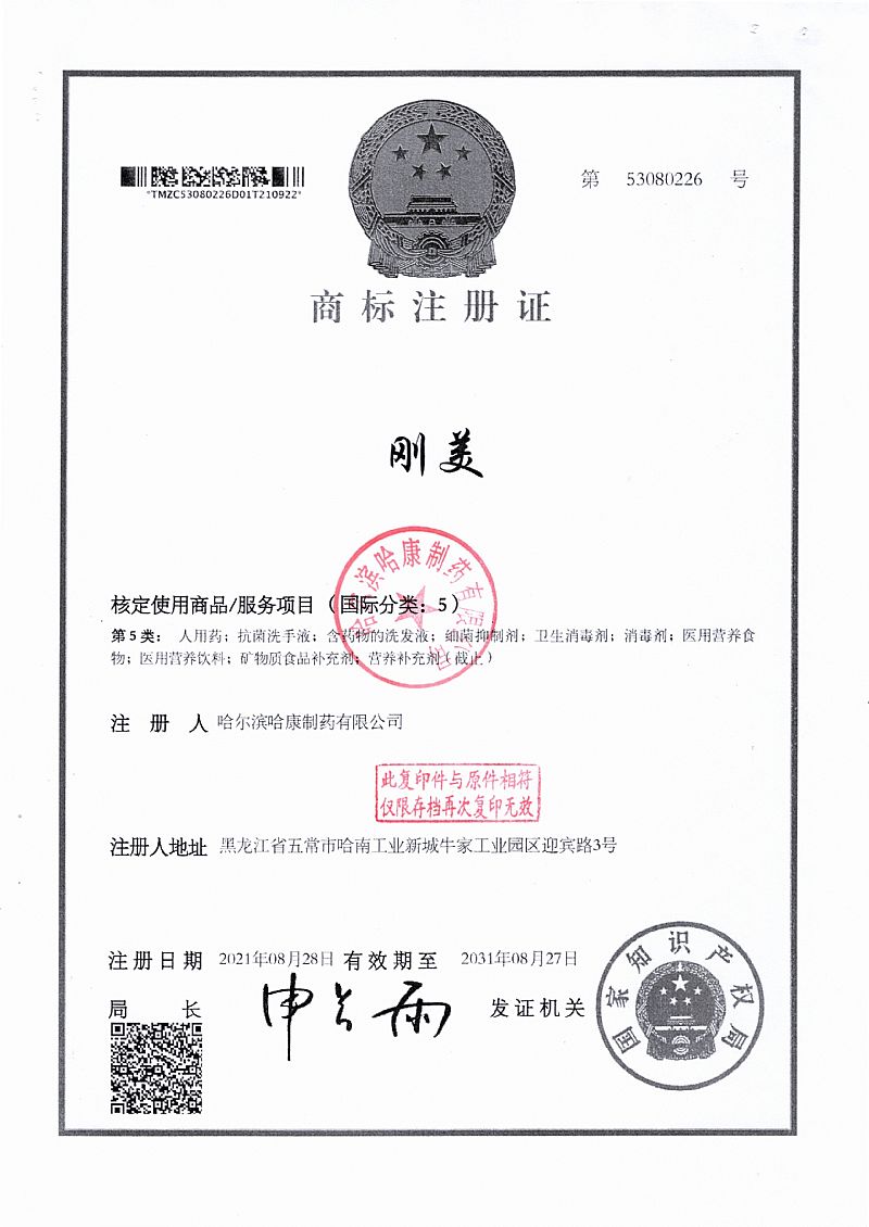 批準(zhǔn)文號: 黑衛(wèi)消證字2020第0218號