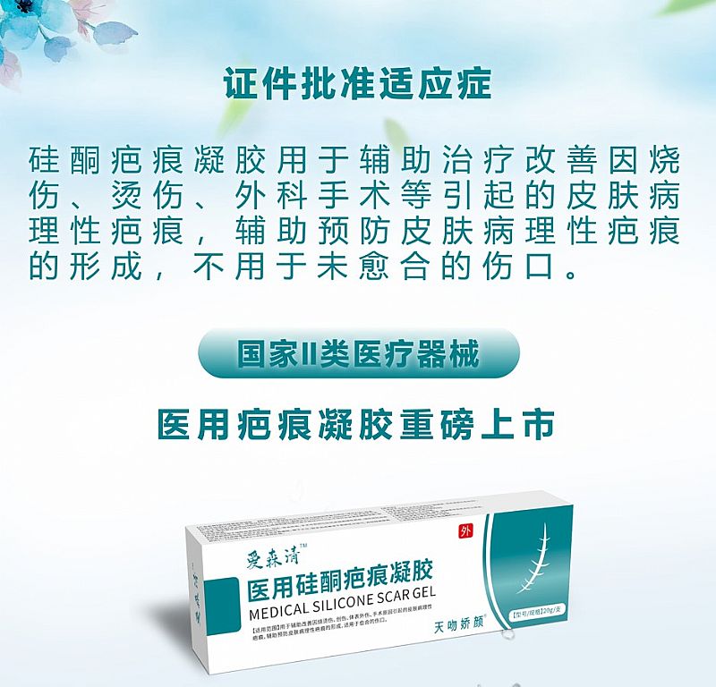 | 產(chǎn)品用途 | 用于輔助改善因燒燙傷,創(chuàng)傷,體表外傷,手術(shù)原因引起的病理性疤痕,輔助預(yù)防皮膚病理性疤痕的形成,適用于愈合的傷口。 |