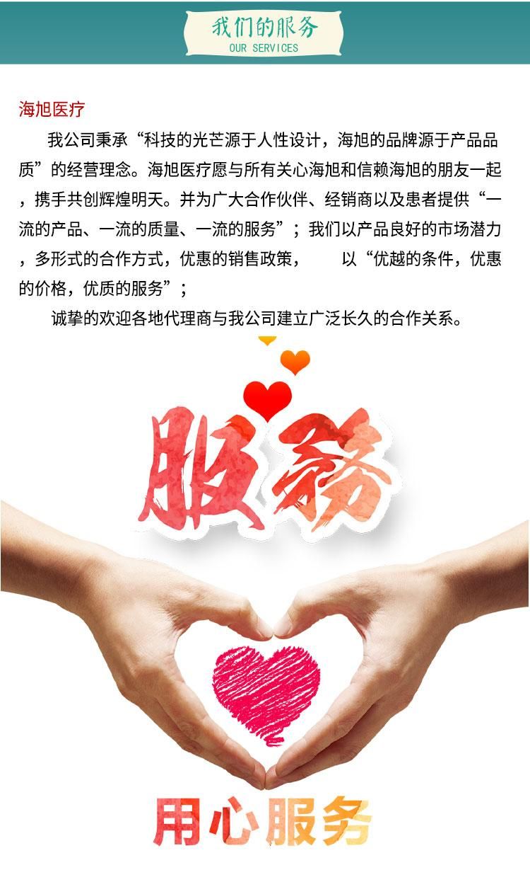 我公司秉承“科技的光芒源于人性設(shè)計(jì),海旭的品牌源于產(chǎn)品品質(zhì)”的經(jīng)營理念。海旭醫(yī)療愿與**關(guān)心海旭和信賴海旭的朋友一起,攜手共創(chuàng)輝煌明 天。并為廣大合作伙伴、經(jīng)銷商以及患者提供“**的產(chǎn)品、**的質(zhì)量、**的服務(wù)”;我們以產(chǎn)品良好的市場潛力,多形式的合作方式,優(yōu)惠的銷售政策, 以“優(yōu)越的條件,優(yōu)惠的價(jià)格,優(yōu)質(zhì)的服 務(wù)”,誠摯的歡迎各地代理商與我公司建立廣泛長久的合作關(guān)系。