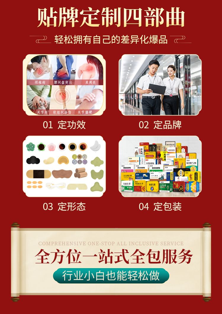 | 其它說明 | 我司產品種類齊全,膏藥品種有骨科、婦科、兒科、男科等,主營穴位貼敷治療貼、暖宮貼、小兒貼、遠紅外理療貼、磁療貼、隔物灸、熱奄包、磁灸熱貼、三伏貼、灸熱治療貼、熱療貼、退熱貼等。生產高分子產品注射器、輸液器、留置針、采血針、鼻氧管、鼻胃腸管等耗材齊全,生產代工藥食同源功能性食品壓片糖果、固體飲料、膏滋、膠囊等多種劑型。我司自營品種面向全國誠招區域代理商,廠家直供,底價供應,一件起發。一站式品牌定制服務,擁有專業的研發團隊,代工定制膏藥、凝膠、功能食品、****等多個品種,起訂量靈活,大單小單均可承接!免費打樣,免費使用資質文號,您沒有資質、沒有工廠也可做產品當老板!歡迎您來廠實地參觀考察!歡迎致電廠家24小時咨詢電話:15665867330(微信同號) |